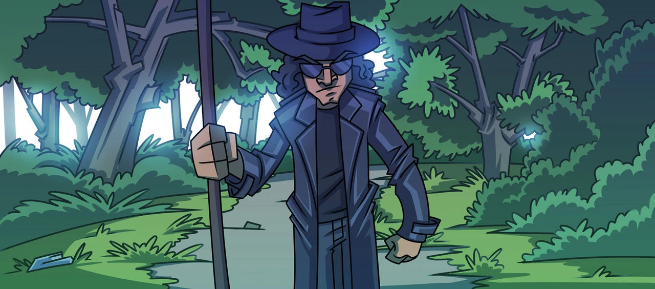 The party looks intimidated. Luke is unsure of what's going on, then notices they aren't looking at him. He and Film Brain turn around to see the mysterious person from moments ago, staring dramatically at them.